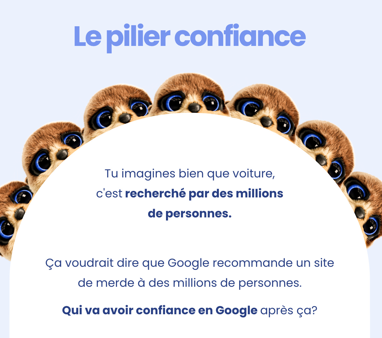 Si tu es positionnĂ© sur un mot rechercheÌ par des millions de personnes mais que tu es un site vraaaiment pas fiable, eh bien ça voudrait dire que Google recommande un site de merde aÌ des millions de personnes.