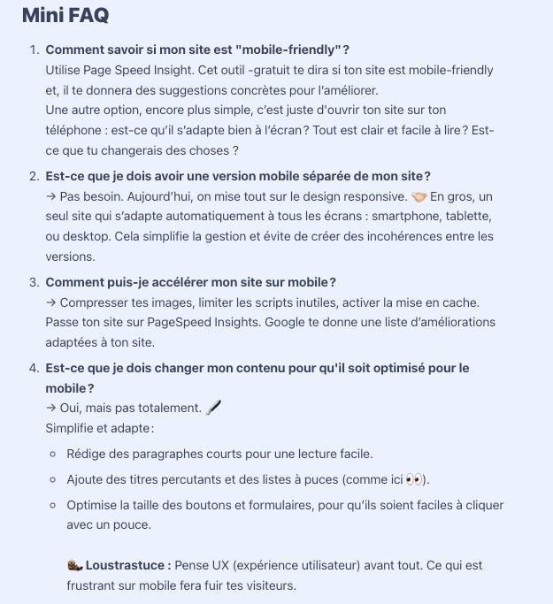 En fin de page, d’article, tu peux inclure tes mots-clés longue traine sous forme de mini-faq. Je le fais d’ailleurs souvent dans cette newsletter !