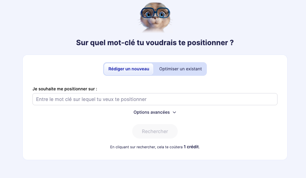 Tu pourras “Créer un nouveau contenu” ou “Optimiser un contenu existant”, `