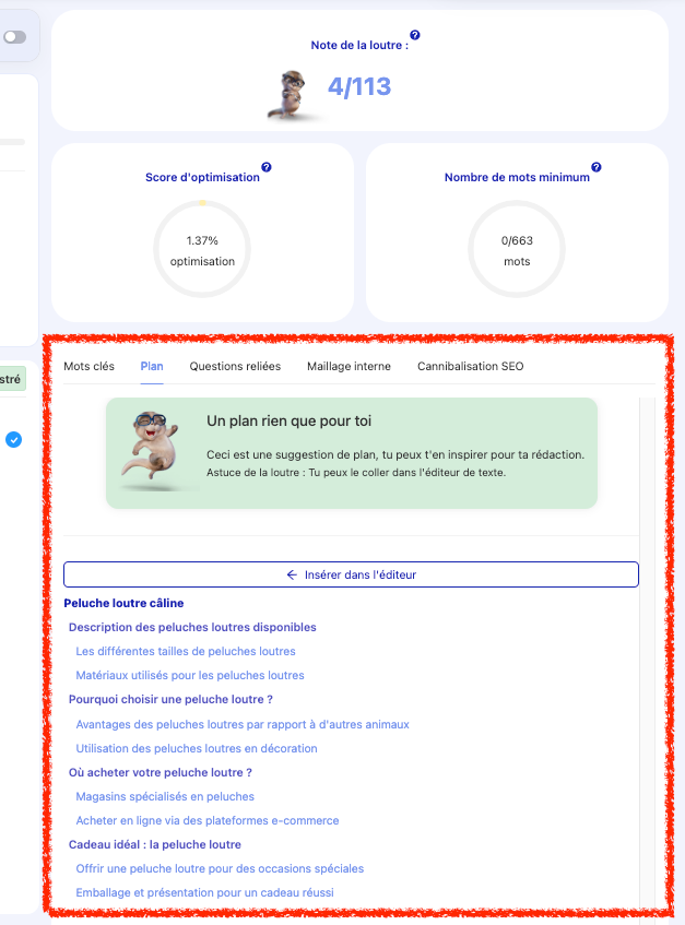 Imaginons que j’ai choisi mon mot-clé “peluche loutre” et je suis dans mon éditeur pour rédiger mon article.