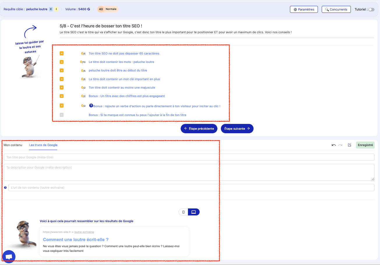 Si tu écris un article sur des peluches loutres, ta requête cible, ça sera probablement “peluche loutre”. Tu l’as choisi grâce à l’étude de mots-clés que tu as mené avant (évidemment).