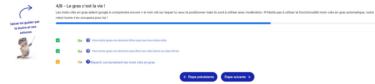 1. N’abuse pas sur le gras SEO, Google peut te pénaliser si tu l’utilises trop. On te recommande 1 mot en gras tous les 100 mots environ.