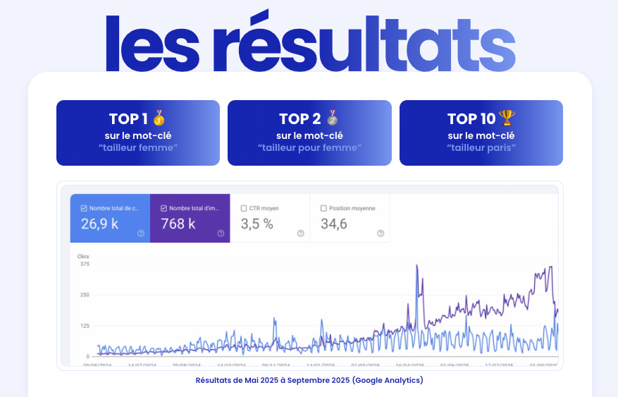 On a donc corrigé et optimisé ce qui empêchait Google de comprendre le site correctement (structure, pages clés, éléments bloquants, etc.). Quand la base technique est propre, tout le reste “prend” mieux.