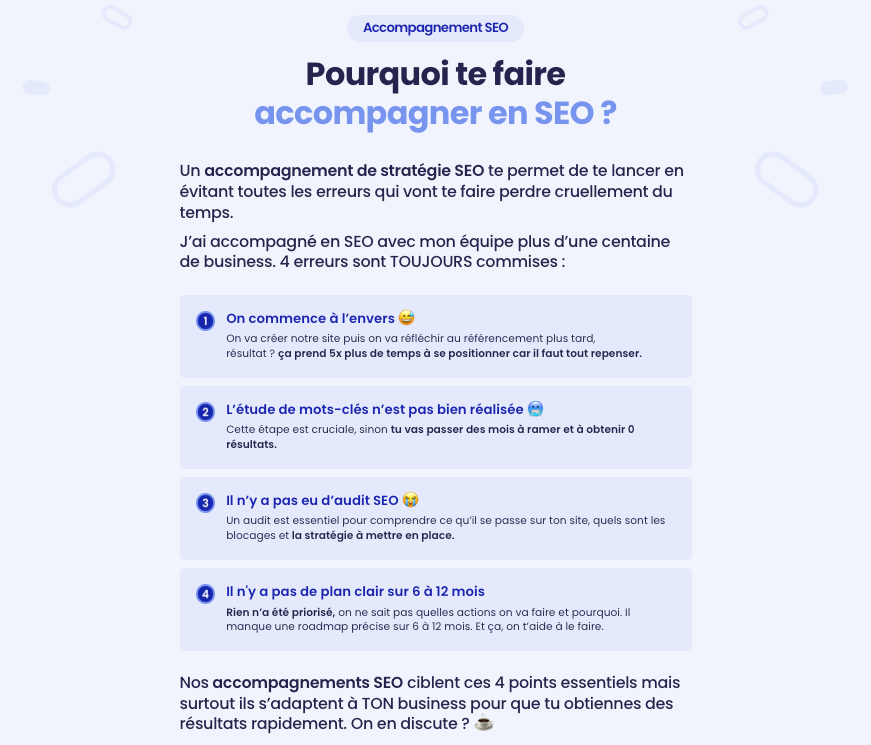 Et ça, c’est un truc qu’on voit tout le temps. Tu sais que le SEO peut t’apporter du business, mais entre la technique, le contenu, les mots-clés, la Google Search Console et les “il faut faire des backlinks”, les “faut que je suive mon mot-clé” et que “j’optimise ma page”, etc.